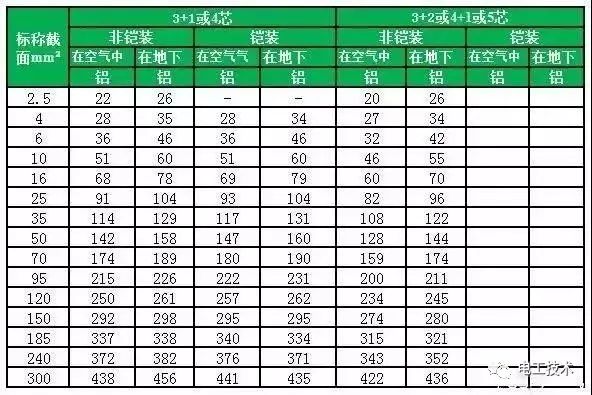 常見電纜的載流量一覽表